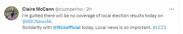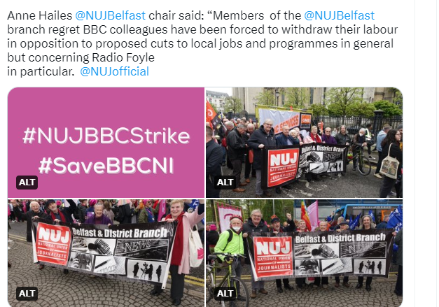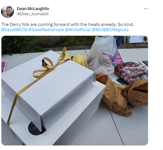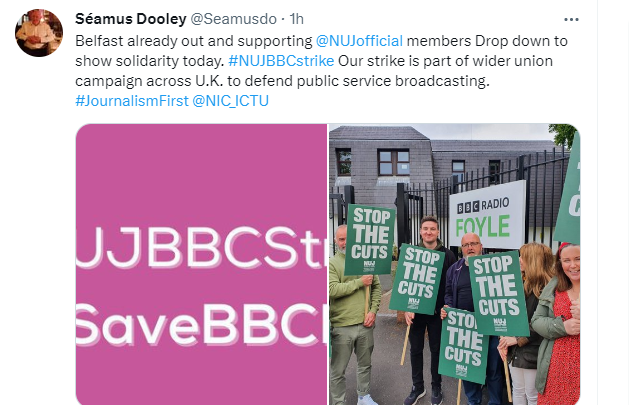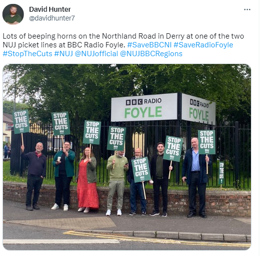 Solidarity with journalist colleagues at @bbcradioulster and @BBCRadioFoyle, on strike today over cuts to local journalism services, including the dramatic scaling back of Radio Foyle